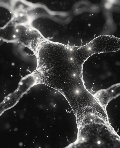 3w Whites tones of the technology side showcases intricate, glowing circuit patterns or a complex network of interconnected nodes. The lines and nodes gradually transform into more organic, neuron-like structures as they approach the diagonal divide --ar 1051:1299 --v 6.1 --s 750