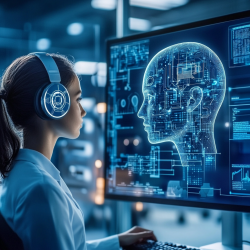 Visualize a futuristic software development environment where AI has become the key enabler for entrepreneurs, transforming the role of developers from coding to innovation. Highlight AI-powered tools seamlessly augmenting developers’ abilities, allowing them to focus on creativity and customer-centric problem-solving. Show a dynamic workspace where technology is accessible to everyone, breaking down barriers and democratizing software development. Include visuals of developers engaged in system building and user experience design, with AI tools at the forefront, enhancing productivity and efficiency. Capture the essence of a tech-driven future where continuous learning and upskilling are vital, and innovation takes center stage.