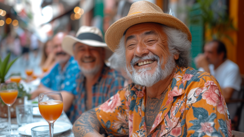 happy and laughing, Old native napolitan people aproximetly 85 years, with shirt and tattoos, in the old napoli street, drinking coffee and talking with friends, Leica MP Leica Elmarit 28mm f/2.8 III Kodak Portra 400 Bellini Foto C41 Scan from negative film, color image with noise chaos 85 --v 6.0 --s 789 --ar 16:9