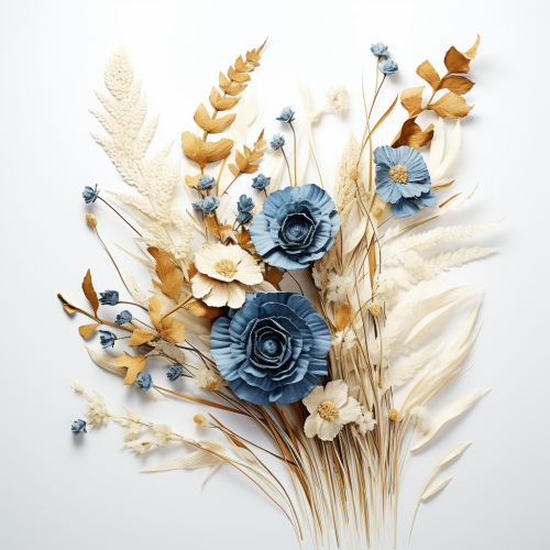 dried florals, 3D, blue, gold, white, neutral, isolated on white background