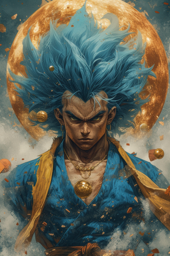 a cover for dragon ball legends, in the style of comic book style, dark sky-blue and gold, detailed shading, ricoh ff-9d, energetic gestures, mythological influences, duckcore --ar 2:3 --stylize 750 --v 6.0