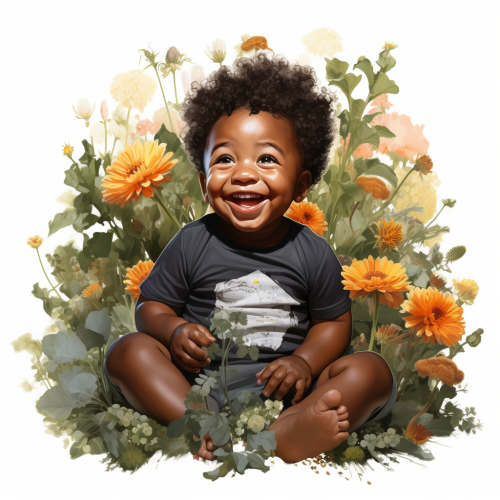 happy black baby in garden of flowers sitting on his bottom giggling white background animated