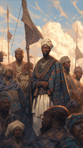 Mansa Abubakari II from Mali empire, during the 14th century on a great oceanic expedition, with sailors who demonstrate pride, power and courage, create a historical scene that reflects the legend that tells about the arrival of Mansa Abubakari II from the empire of Mali to America. Rendered in Osazume Okonofua's Midjourney style, the image showcases 8K-level detail, evoking profound reverence and enigma, deep African eritage. Color temperature: Regal. Lighting: Majestic. Atmosphere: Powerful. --stylize 1000 --ar 9:16 --niji