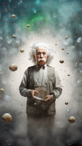 Hyper-realistic Einstein unveiling the answer to 'chicken or egg' mystery. Background of Earth and abstract thought bubbles. --ar 9:16 --v 5.0