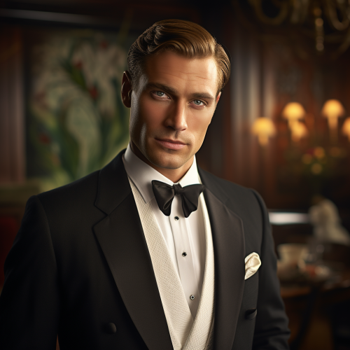 a handsome, wealthy man in his early thirties, with a charismatic and enigmatic presence. He has a lean, athletic build, tanned skin, and short, well-groomed hair. Often impeccably dressed in opulent, tailored suits, he exudes the extravagant glamour and mystery of the Jazz Age