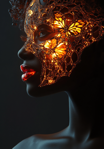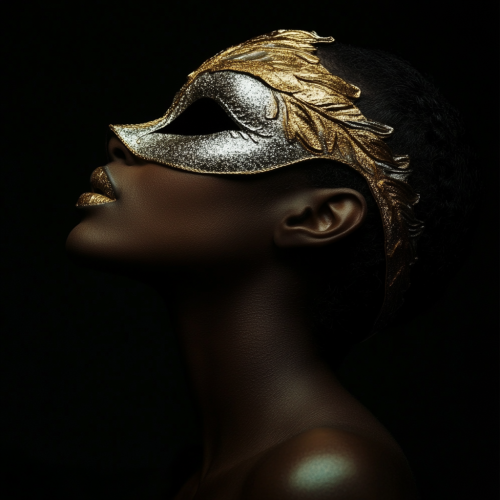realistic photograph of a side profile African American woman wearing a gold and silver Mardi Gras mask that covers her face with a solid black background
