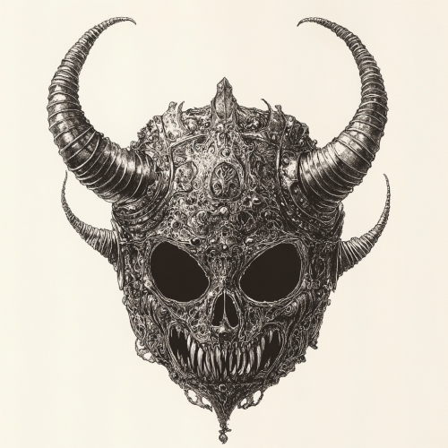 Illustrate a mysterious and intricate mask or helmet inspired by Edward Gorey’s style, featuring exaggerated and surreal elements such as swirling horns, ornate details, and sharp, tusk-like teeth. Employ meticulous cross-hatching to highlight the metal textures, rivets, and complex patterns, giving it a sense of depth and age. The mask should evoke a sense of ancient craftsmanship and mythological mystery, as if it belonged to a creature from a forgotten legend. Keep the background minimal, using negative space to amplify the eerie and enigmatic quality of the mask, while allowing the viewer’s focus to fall on its intricate design and haunting presence.