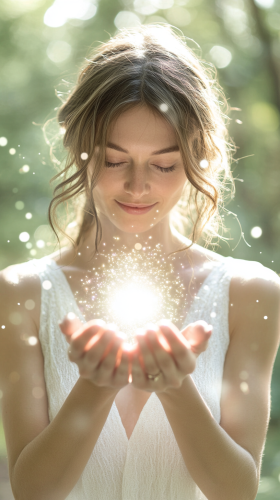 A beautiful woman holding shimmering particles of light in her hands, surrounded by a dreamy atmosphere. She has a soft expression as the glowing light emanates from her palms, spreading gently around her. The background is a blurred natural scene with soft green light filtering through. She is dressed in a white gown, creating an overall mystical and magical moment. Her posture and the radiant energy symbolize healing, hope, and a miraculous power. --ar 9:16 --v 6.1