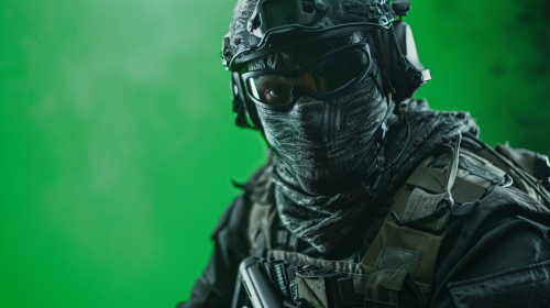 Cinematic portrait of a call of duty operator his face completely hidden behind a mask, cyberpunk style outfit and mask, half body view, standing pose, green screen background, highly detailed, hyper realistic, UHD, HDR --ar 16:9 --v 6.0