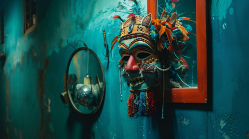 a hyperealistic photo of an elaborate colourful mask hanging next to a mirror on a teal wall, --ar 16:9 --v 6.0