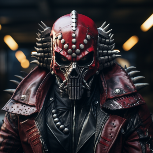 rockstar wearing eccentric crimson leather outfit and a black cyberpunk helmet mask that looks like a skull with a crown of spikes and a mouth piece like bane