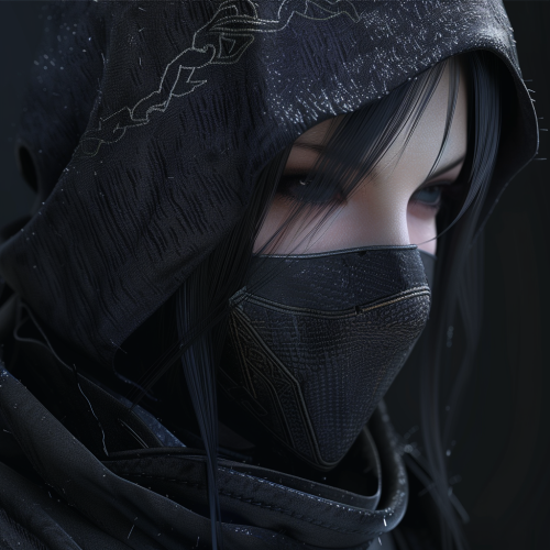 final fantasy woman with hooded with mask and black ninja outfit, dark eyes, dark clothes, she is in profile, character design, background dark, 8k, 300 dpi, HD, --v 6.0