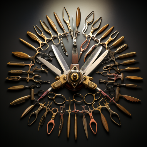 a lot of classic barber scissors that cut a lot of hair that is flying arround