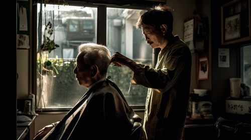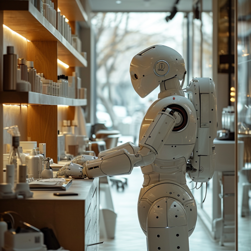 Inside a modern barber shop, a robot with articulated arms is giving a perfect haircut to a relaxed customer. The robot's design is sleek and polished, and the atmosphere is calm and welcoming. --s 750 --v 6.0 --style raw