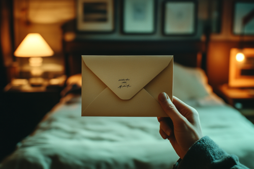 1994, interior bedroom, Wes Anderson style, close up POV of envelope held in male teenage hand, wearing blazer, return adress on front of envelope, color film --ar 3:2 --style raw --s 250