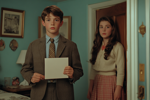 1994, Wes Anderson style, interior bedroom, nerdy teenage boy wears a blazer and tie, holds an envelope, his older sister stands at the door, color film --ar 3:2 --style raw --s 250