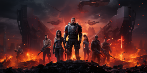 cyberpunk video game scene with multiple characters all standing together prepared for battle facing the camera with explosions in the background --ar 2:1 --s 250