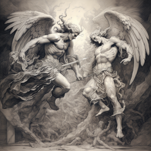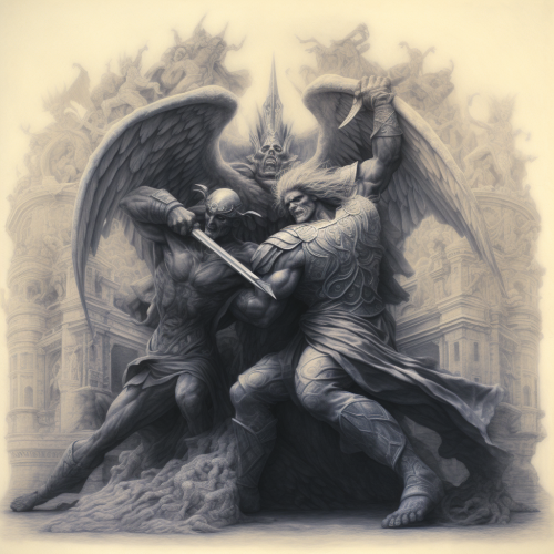 fighting of a winged demon against an archangel, esoteric symbols in the background, Caravaggio style, oil painting, warm and intense reds, dark blacks