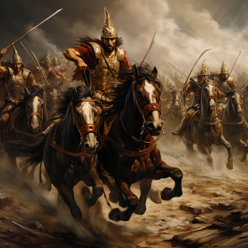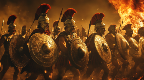 Hoplites engaging in a fierce battle against Persian warriors, dust and chaos all around, with the clash of metal and cries of war. Hyper Realistic HD photos --v 6.1 --ar 16:9