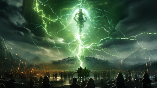 battlefield full of asian inspired greek scifi warriors from the litRPG series Defiant of the fall. green lightning filled with the dao of suffering striking the fractal forceshield of an protective array. ultrarealistic movie still --ar 16:9