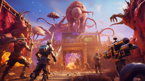 Fortnite game screenshot. tps. Warriors fighting with guns. --aspect 16:9
