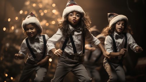 Eccentric and quirky children performing a Christmas dance. Festive stage backdrop. They are meticulously posed and positioned in a minimalist symmetrical setting. Black and white with vibrant color splash. Vibrant hues. Tapestry of whimsy. nostalgia with a dash of quirky charm. Shot with a Pentax. K - 3 III Monochrome. Santa hats. Christmas tree in background. Presented in abstract impressionistbart style. Extreme close - up camera angle. Very close. Low angle camera shot. Looking straight up, Blurred background. Bakeh elements. High - end. Very Stylish. Black and white photograph. --ar 16:9 --q 0.5 --s 750