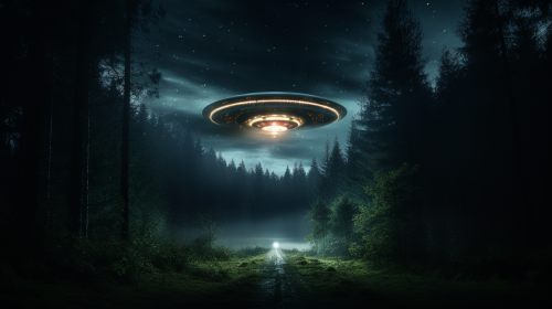 A UFO flying in the sky in the middle of the dark woods, bright lights coming off of the UFO --ar 16:9