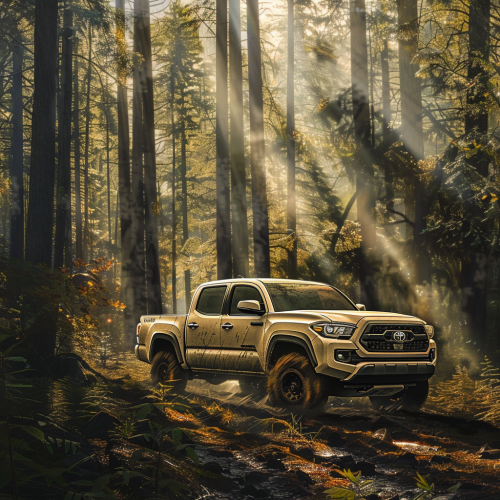 a fantasy inspired painting illustration of a 2023 Toyota Tacoma in the woods