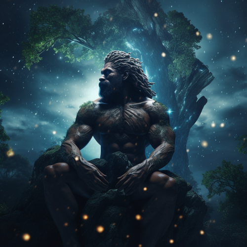 a male mythical dark skinned hairy muscular creature perched on a big tree at night with fireflies flying around in a fantasy setting
