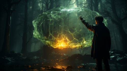 content: a man, bioluminescent creature in his hand, explores the forest, using it for light. Style: Dark, gothic, but the light should be electric bright --v 5.2 --s 750 --ar 16:9