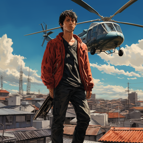 a japanese gentle man with black hair wearing black bantalon and red t-shirt and light blue jacket standing on a roof and behind him a helocopter