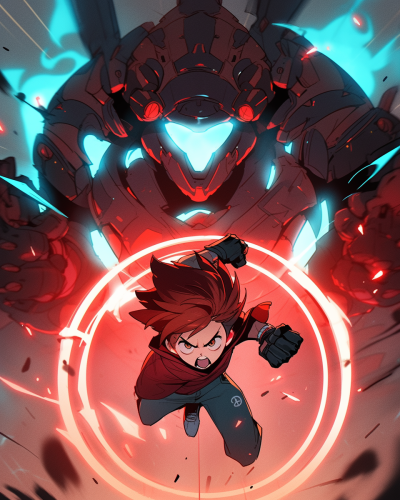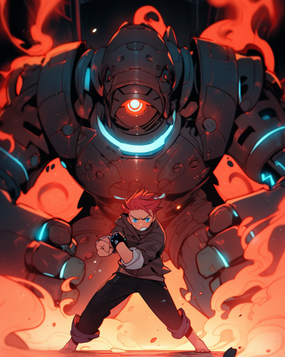 A dark comic book style illustration of an angry young man with black hair and glowing red eyes. He is wearing a t-shirt, his face has scars on it, and he's looking down at the ground against a dark background, with red light illuminating him from behind. It is a close up portrait in the graphic novel art style.