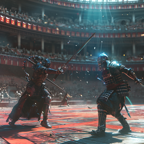 A cyber samurai attacks a gladiator in a fictional arena --v 6.0 --ar 1:1