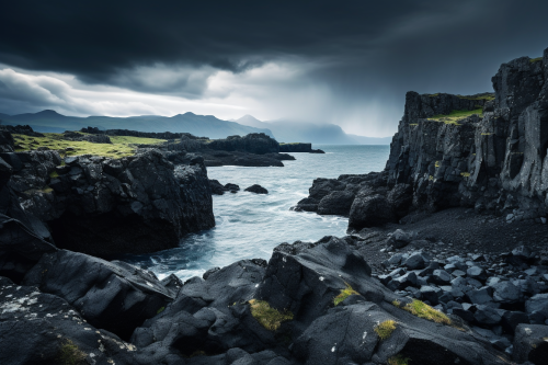 an area of steep rocky cliffs, the earth is grassless, in the background is a volcano, styled in a flat, polygonal design, dynamicpolygonal design, dynamic --ar 2:1 --v 5.1