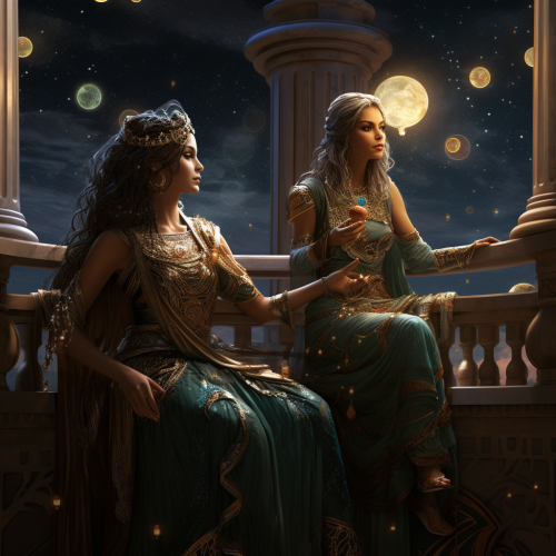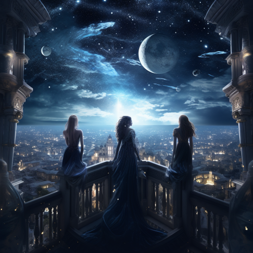 80s medieval dark fantasy screen grab, wide angle, two Greek goddesses on a palace balcony surrounded by magic, cosmos backdrop with planets