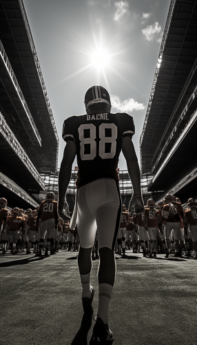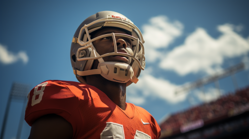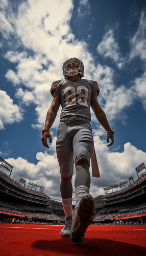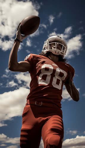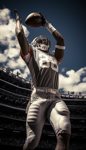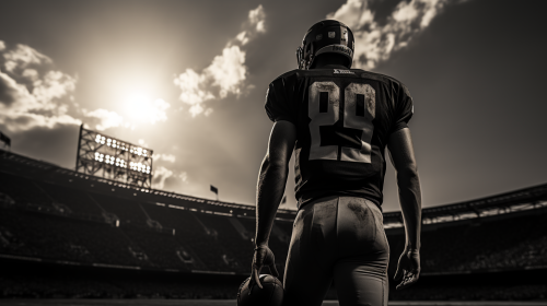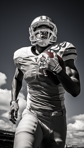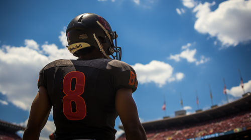 American high school football player. Extreme blue skies. Rear view of football player. Picture taken from behind football player. Action shot on the field. Extreme low angle shot. Black and white with vibrant color splash. Full body shot. Jersey number “8”. Quarterback scoring game winning touchdown in final seconds of the game. In the style of a sports illustrated cover photo. Geometric. Dramatic. Award winning. Packed stadium. Extreme blue skies. Exciting. Photorealistic. High - end. Stylish. Shot with a Pentax. K - 3 III Monochrome. --ar 16:9 --q 0.5 --s 750