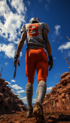 American high school football player. Extreme blue skies. Rear view of football player. Picture taken from behind football player. Action shot on the field. Extreme low angle shot. Black and white with vibrant color splash. Full body shot. Jersey number “8”. Quarterback scoring game winning touchdown in final seconds of the game. In the style of a sports illustrated cover photo. Neon minimalist. Dramatic. Award winning. Synthwave.Packed stadium. Extreme blue skies. Exciting. Photorealistic. High - end. Stylish. Shot with a Pentax. K - 3 III Monochrome. --ar 4:7 --q 0.5 --s 750