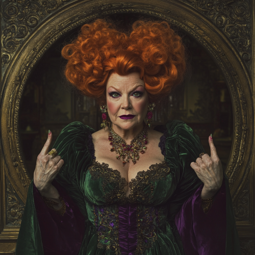 Create a hyper realistic style portrait of a mature woman in her 50's that looks exactly like actress Bette Midler. She wears a very curly Copper Orange tall up-do Rococo style wig with two buns. She is wearing a dark green and mint green and Purple and gold dress. She wears a green velvet cloak. She is a full figured lady with two red orange circles of blush on her cheeks. She has Orange and purple eye shadow. Her lips are parted and her big teeth are shown as she speaks to out a spell on me. She is standing on a staircase of a spooky mansion. She is looking at the camera with her two hands with palms facing up. Her eyes are hypnotic. She has very thin eyebrows and a forehead with frown lines. This is a full body shot so we see her from head to toe in her stunning Rococo style gown and green velvet cloak. She has jewels and rhinestones that embellish her gown. This entire scene is framed within a very large and thick antique gold wooden circle Victorian Rococo style design frame that has lots of details and is very ornate. The frame has fancy filigree and paisley and roses carved into the frame. --v 6.1