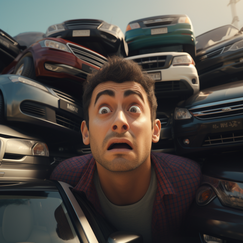 closeup of the face of a man trying to escape from a stack of cars, closeup, topshot, high definition, DOF, 8K, color grade, huge ligthing, huge render, photorealistic, cinematographic, high detailed, color palette is bright and warm, anamorphic
