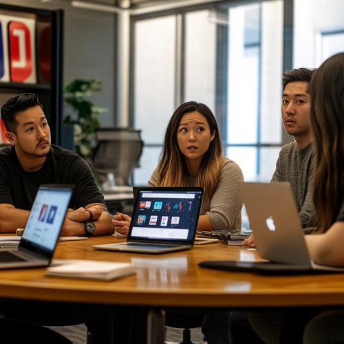 A team of diverse social media experts discussing strategies, various marketing data and campaign elements on digital dashboards, modern collaborative workspace, vibrant atmosphere, professionals from different fields contributing ideas, realistic, high-definition, natural lighting --ar 16:9