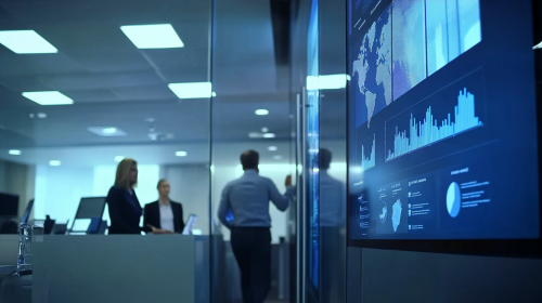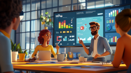 A modern office environment, a team collaborating and discussing strategies, dynamic display of marketing analytics on digital screens, professional attire, vibrant natural lighting, focused atmosphere, HD quality, professional photography, realistic, natural look --ar 16:9