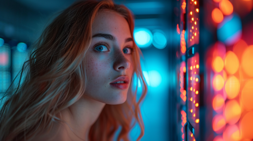 a captivating Raw movie still of a beautiful woman, in a server room, hacking into the computer, it's really hot and she is perspirating good, blue and orange lighting, cinematic shot, award winning cinematography, dynamic angles --v 6.0 --ar 16:9 --s 750 --style raw