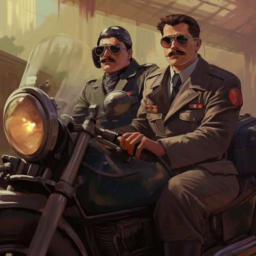 Two Gestapo agents in a sidecar The one driving has a long thin mustache and aviator glasses.