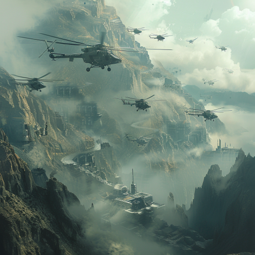The valley's air hums with the incessant buzz of helicopters, their sleek forms slicing through the smog-choked skies like avenging angels. Controlled by faceless corporations and shadowy syndicates, these airborne sentinels cast their gaze over Mount Ovel, their presence a constant reminder of the ever-watchful eye of power.