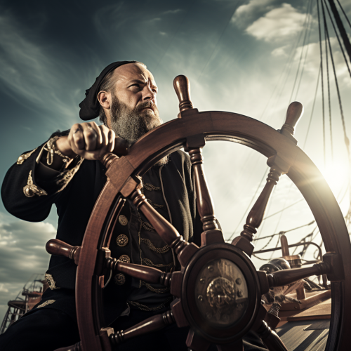 007 on the helm of a pirate ship on a calm transulid sea and clear sky