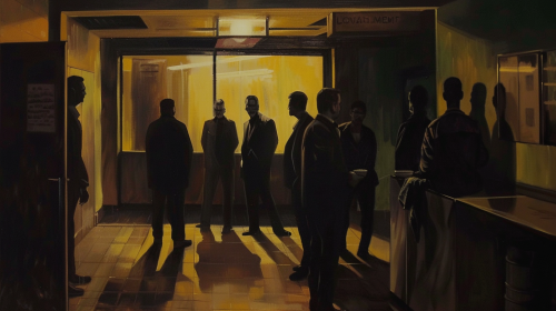 oil painting look, LOAN ME 123 BREAK ROOM - MAÑANA Los agentes esperan en la oscuridad, iluminados por una candela en forma de siete --ar 16:9 --s 50 --v 6.0