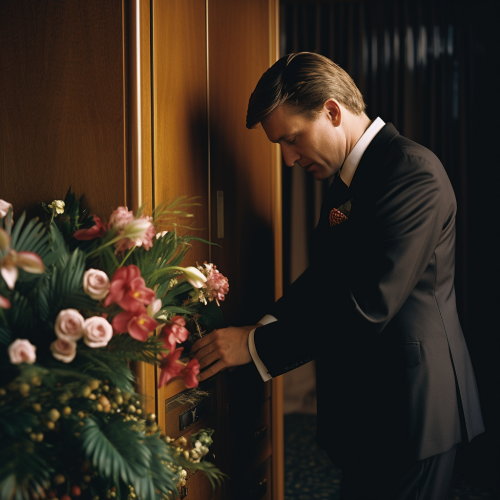 A man wearing a suit putting a box into his jacket pocket in a hotel suite with a few elegant floral decor at pan pacific hotel, 35mm lens