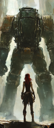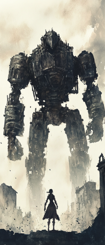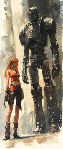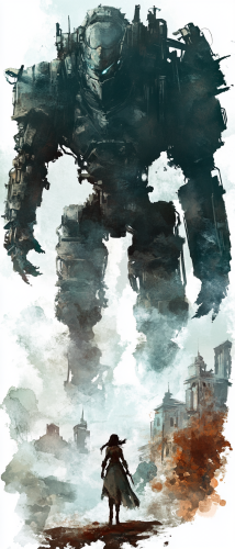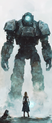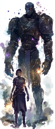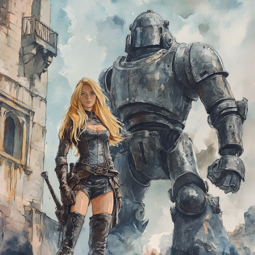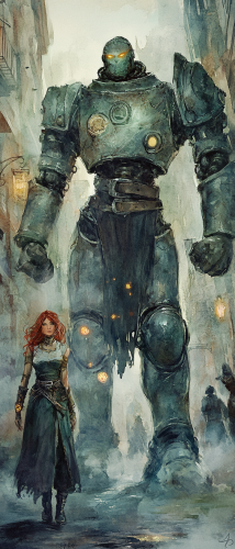 A female adventurer with a large metal golem construct. Dark fantasy setting. Watercolor art style. Mood is eerie and ethereal. Background is a medieval city, partial watercolor with some white space. --ar 3:7