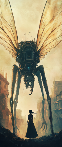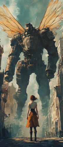 A fey tinker with translucent bug-like wings. Her wings are folded down. She is standing in front of her large metal golem friend. Dark fantasy setting. Mood is eerie and ethereal. Smooth watercolor art style. Background is a medieval city. --ar 3:7