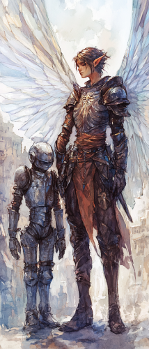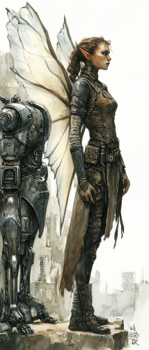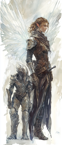 A fey adventurer with translucent wings. She is wearing leather armor. She is standing beside her metal golem friend. Dark fantasy setting. Mood is eerie and ethereal. Smooth watercolor art style. Watercolor background is a medieval city, partially white around the edges. --ar 3:7